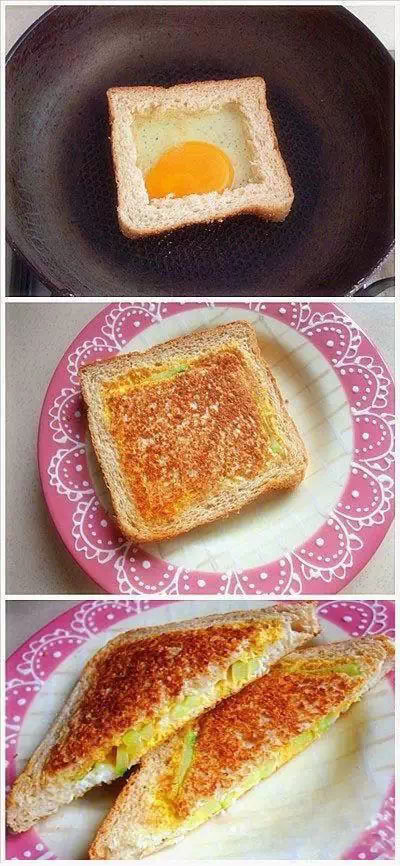 面包中間挖掉,打入蛋,加入黃瓜、芝士片、火腿等,烤熟后澆上番茄醬!