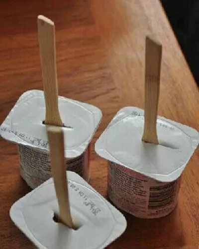 盒裝酸奶頂部開小口,插入冰棒棍兒放冰箱冷凍室凍硬!
