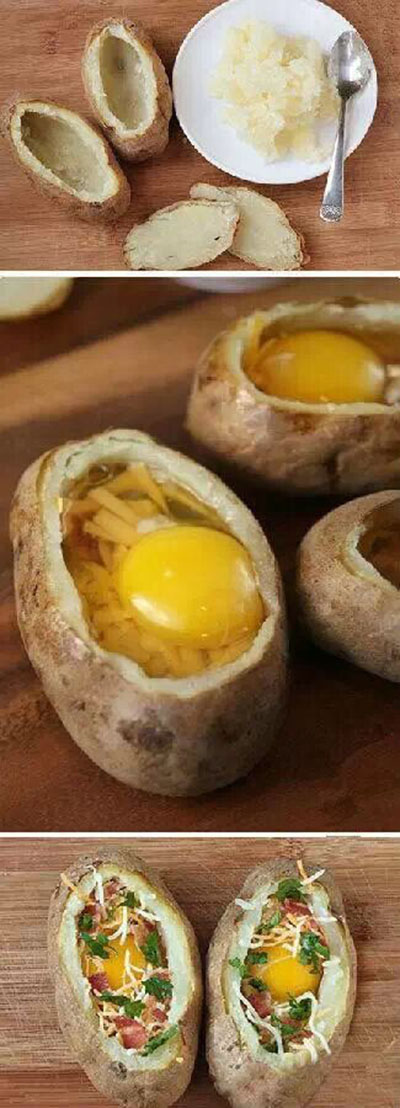土豆洗凈蒸熟,挖空后塞點(diǎn)蔬菜培根之類的,打入一個(gè)雞蛋,放入烤箱烤熟!