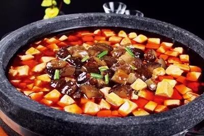 此菜把牛腱子肉、牛蹄筋加入大量的蔬菜料、剁椒、牛肉醬一起高壓,成品肉質(zhì)細嫩,蹄筋爽滑,口味香辣。