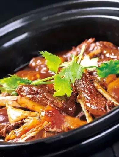 3、鍋上火,放入提前壓好的牛肉、牛板筋和牛蹄筋,倒入壓牛肉的原湯500克,大火燒熱,裝入煲仔爐內(nèi),點綴香菜梗,加熱上桌即可。