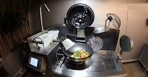 這是一款德國人發(fā)明的自動炒菜機??梢愿鶕似吩O定程序!淋油、加菜、翻炒,還能顛勺……連刷鍋都是自動的……