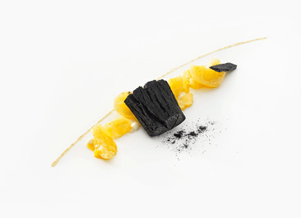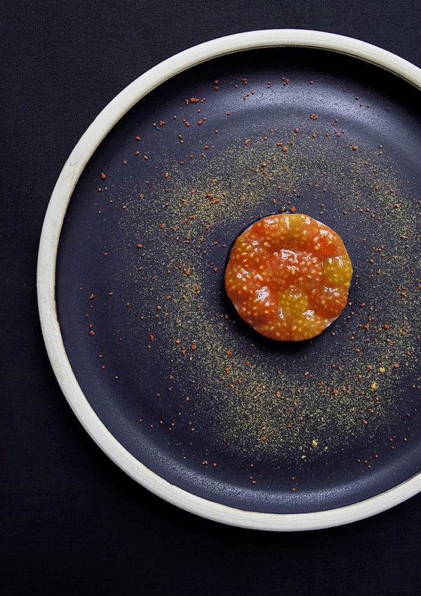 ↑↑↑大西洋小龍蝦卵點(diǎn)綴番茄,又是一個同心圓的擺盤方式,與黑色的盤子特別配。
