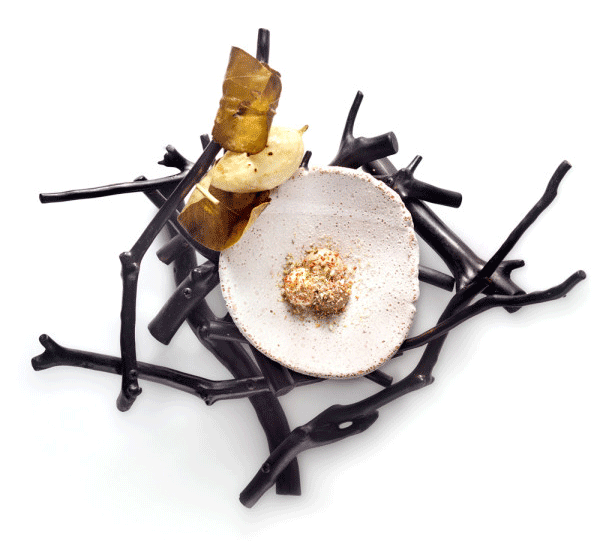 ↑↑↑交錯的黑色樹枝,粗糙破損的瓷器餐具,呼應(yīng)著盤中看似簡單卻工序復(fù)雜的料理,我們吃的不是食物,是情懷!