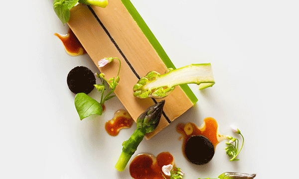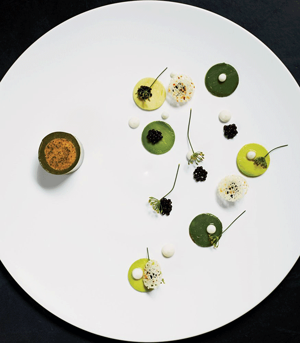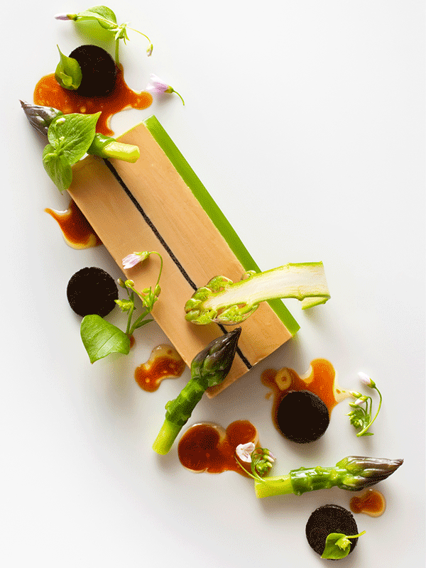 ↑↑↑綠色醬汁打底,點(diǎn)綴紅蘿卜、紫洋薊、碗豆等春季蔬菜的鮮艷色澤,5:5的精致比例,在視覺上完美平衡。最后再撒上黑松露,Bingo上桌!