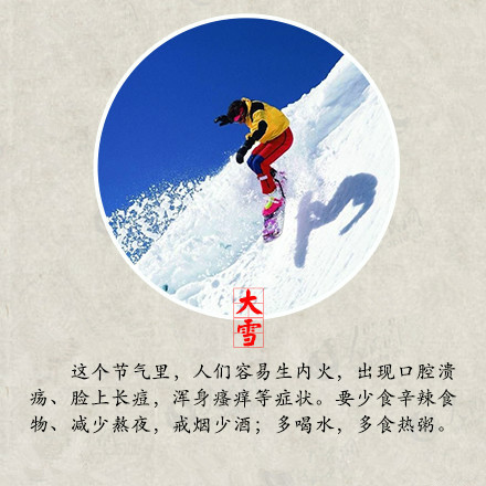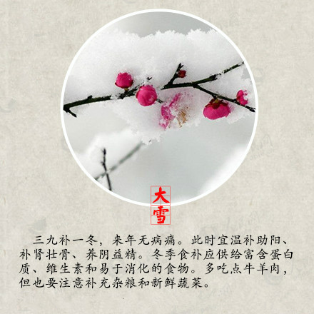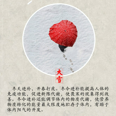 昨日本是大雪節(jié)氣,但是今日這場大雪才如約而至,你有沒有和雪來一場互動呢?堆個雪人,打個雪仗,在綿綿的雪地上留下自己的腳印,但是玩耍的同時大家不要忘記注意保暖哦! 大雪時節(jié)是身體進(jìn)補(bǔ)的大好時節(jié),大雪補(bǔ)養(yǎng)得當(dāng),來年就有很堅實(shí)的身體底子,抵抗疾病的侵?jǐn)_。萬物生機(jī)潛藏,不宜擾動陽氣,鍛煉方面應(yīng)動中求靜,保持心情沉靜愉悅,起居方面應(yīng)早睡晚起,避免受寒,居室溫度宜保持在16~20℃,濕度宜保持30%~40%,濕度過低會造成咽喉干燥,引發(fā)上呼吸道疾病的發(fā)生。