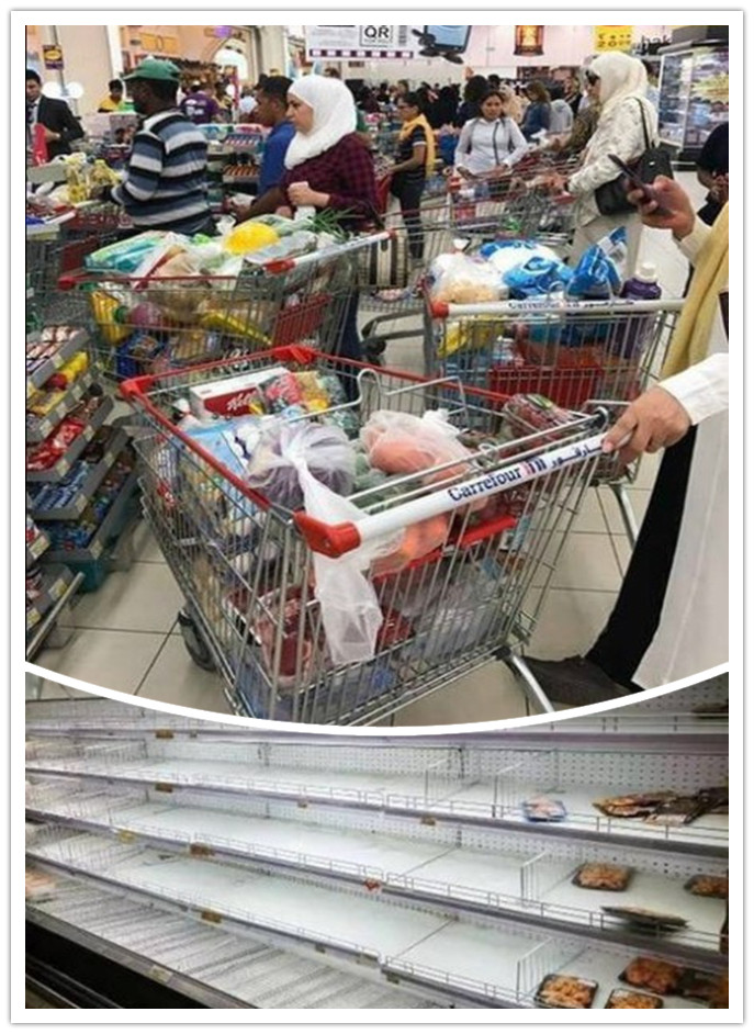 多個(gè)國家以卡塔爾支持恐怖主義活動(dòng)為由,宣布與其斷交。海灣國家之間出現(xiàn)分歧并斷交并非首次。但此次卡塔爾所有的陸路通道被封,恐成為孤島。而其40%食品供應(yīng)都是從沙特阿拉伯進(jìn)口的,居民因此紛紛搶購食品和飲用水,買空超市。