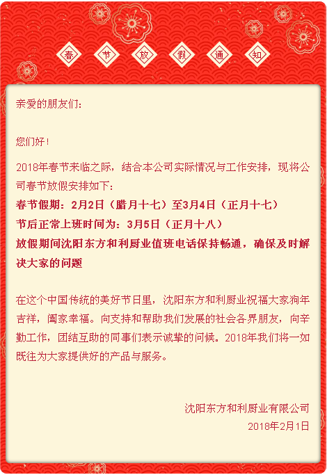 沈陽東方和利廚業(yè)2018春節(jié)放假通知!