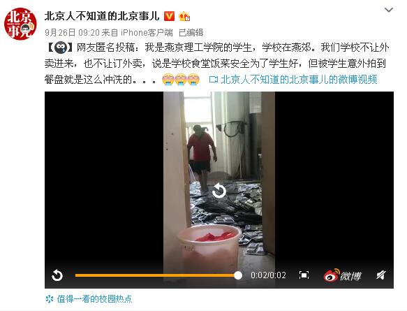 據(jù)河北燕京理工學(xué)院的學(xué)生爆料稱:"我們學(xué)校不讓外賣進(jìn)來(lái),也不讓訂外賣,說(shuō)是學(xué)校食堂飯菜安全,為了學(xué)生好,但被學(xué)生意外拍到餐盤(pán)就是這么沖洗的。"