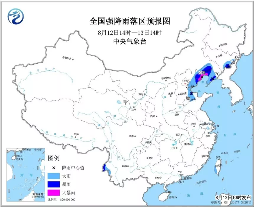 暴雨預(yù)報(bào):預(yù)計(jì),8月12日14時至13日14時,山東西北部、河北東部、天津、遼寧中南部、吉林東部等地有大雨或暴雨,其中,遼寧西南部的部分地區(qū)有大暴雨(100~200毫米)。上述地區(qū)最大小時降雨量20~40毫米。