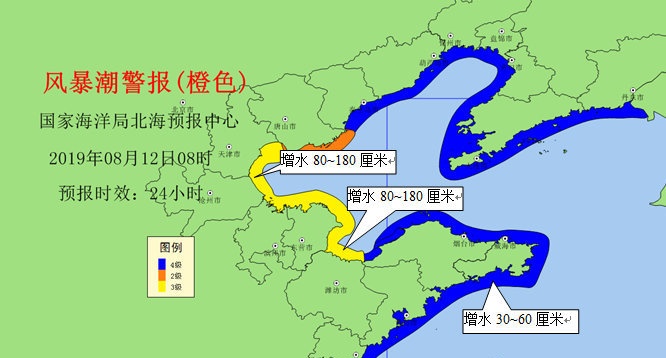 自然資源部北海預(yù)報(bào)中心官方微博發(fā)布風(fēng)暴潮預(yù)警,受今年第9號臺風(fēng)"利奇馬"(熱帶風(fēng)暴級別)影響,預(yù)計(jì)8月12日上午到13日上午,山東半島沿岸將出現(xiàn)30-60cm的風(fēng)暴增水,萊州灣和渤海灣沿岸將出現(xiàn)80-180cm的風(fēng)暴增水。曹妃甸和京唐港驗(yàn)潮站將出現(xiàn)達(dá)到當(dāng)?shù)爻壬涑蔽坏母叱蔽弧H坊港、黃河海港、濱州港、黃驊和塘沽驗(yàn)潮站將出現(xiàn)達(dá)到當(dāng)?shù)攸S色警戒潮位的高潮位,蓬萊、龍口和秦皇島驗(yàn)潮站將出現(xiàn)達(dá)到當(dāng)?shù)厮{(lán)色警戒潮位的高潮位。河北省唐山市預(yù)警級別為橙色,山東省濰坊市、東營市和濱州市,河北省滄州市和天津市預(yù)警級別為黃色,山東省日照市、青島市、威海市和煙臺市,河北秦皇島市預(yù)警級別為藍(lán)色。