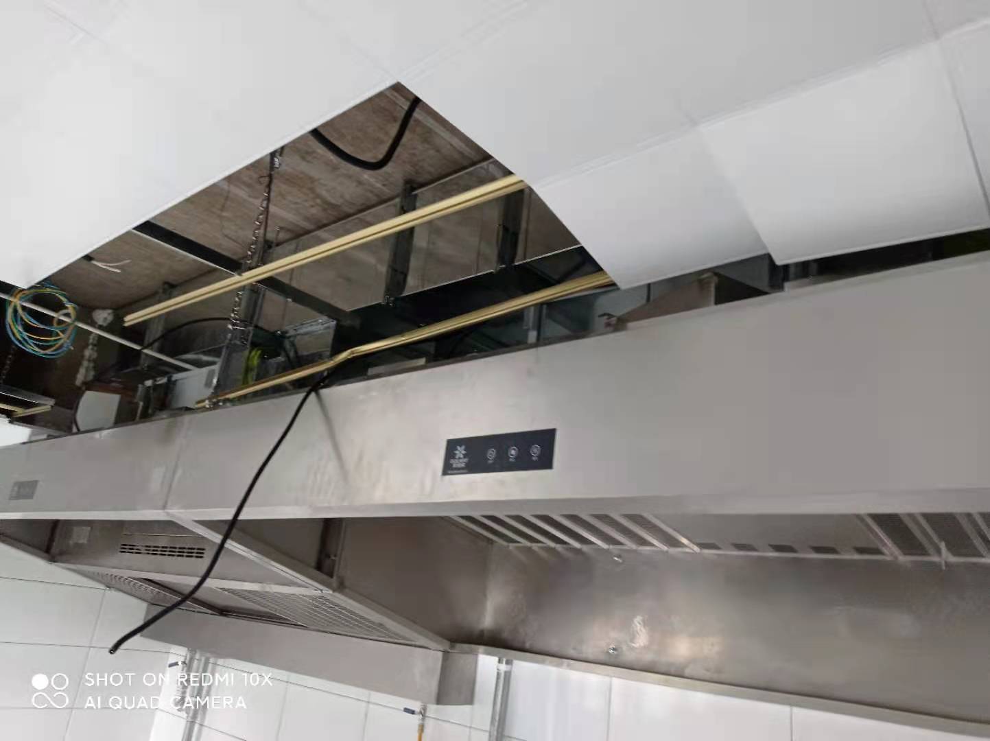副食間、主食間煙罩風(fēng)管對(duì)接完成,五樓明檔煙罩吊完