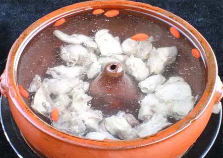 【汽鍋】將肉料腌制后,連同藥材,放入煮滾調(diào)味湯水的一種特制的"氣鍋"中,細(xì)熬而食的烹調(diào)方法。