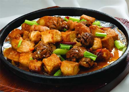 【桑拿】又稱"石烹"等;食物經(jīng)拖油后,投入燒至灼熱的石子(多是雨花石)上,再攢入調(diào)好的汁醬或湯水,利用蒸氣將食物至熟或噴出香氣的烹調(diào)方法。