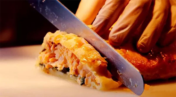 這道烤挪威酥皮三文魚,選取新鮮的挪威三文魚,除去魚骨、魚皮,用海鹽、百里香等秘制調(diào)料腌制2小時(shí)以上。松軟的酥皮將其緊緊地包裹,再以黃油和秘制醬汁淋于表面,中火烤制而成。口感上外酥里嫩,品味三文魚鮮美的同時(shí),還混合著黃油的香味。
