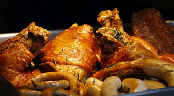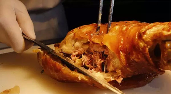 德國咸豬肘,選用肉質(zhì)鮮嫩的豬前肘,浸泡于月桂葉、杜松漿果調(diào)制的鹽水中至少24小時(shí)。次日,先以大火蒸、再用秘制調(diào)料刷,最后再經(jīng)過180度和220度的兩輪烤制,方可上桌兒。這樣的做法,讓豬皮充分膨脹、入口酥脆,外焦里嫩到了骨子里。