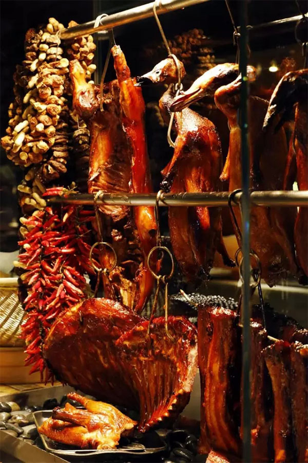 粵式燒臘甘香可口、品種繁多,就連難得一見的明火烤乳豬也現(xiàn)身其中。粵式叉燒在其中較受歡迎。肥瘦相間的豬五花腩以玫瑰露和10余種醬料煨上8小時(shí),醬汁的鮮味噙滿肉身,掛上麥芽糖做的糖色兒,再烤上一陣兒就能出爐啦。