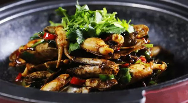 辣炒蟶子絕對(duì)是下酒菜中的種子選手。以美人椒、杭椒爆香,再以秘制豆豉醬汁調(diào)味,大火翻炒蟶子3分鐘即可起鍋。倒入盤中,蟶子色澤飽滿,蟶子肉上滲著辣汁兒,嗦啰一只滿口鮮。
