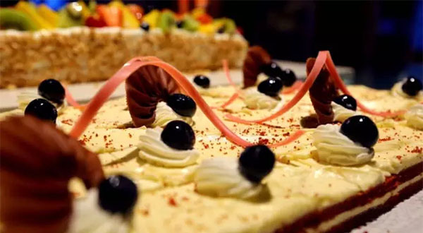 晚餐時(shí),可以自取的甜品多達(dá)30多種,均是由糖立方實(shí)時(shí)供應(yīng)。紅絲絨、芝士蛋糕……香甜絲滑,松軟適中,且不甜膩。食材全部采用國外進(jìn)口,用料精確到克,品質(zhì)得到了極高的保證。