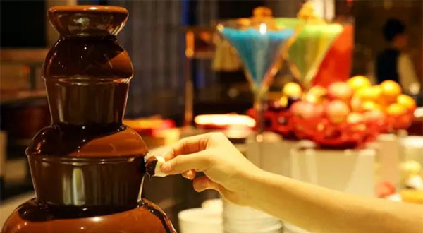 每逢海鮮之夜,都會(huì)備上孩子們的味蕾統(tǒng)領(lǐng)——巧克力噴泉。醇厚的德國巧克力柔滑香甜,在棉花糖表面裹上一層,滿是甜蜜的幸福感。