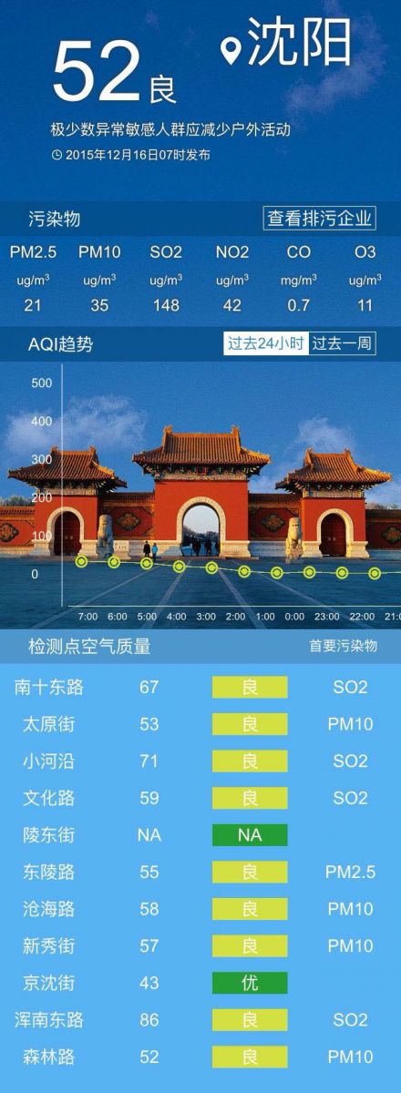 今天是2015年12月16日,星期三。關(guān)注沈城未來幾天的具體天氣:今天上午云量較多,有的地方還會飄落幾個細碎的雪花兒;下午的時候,太陽的光輝將漸漸灑滿我們沈陽大地的每一個角落,偏北風(fēng)3到4級,最高氣溫-4℃;夜間星斗滿天,偏北風(fēng)2到3級,最低氣溫-15℃。
